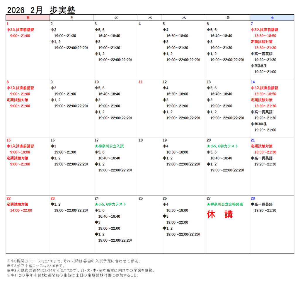 - 学年末試験2週間前の生徒は土日の参加必須となります。