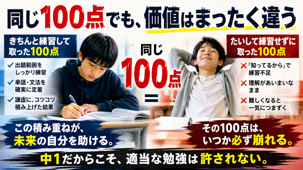 英語の話。 同じ100点でも、中身はまったく別物だ。 出題範囲の英文や単語を、きちんと練習して取りにいった100点。もう一方は、「これ知ってるから」で、ほとんど練習せずに取った100点。 どちらに価値があるか?言うまでもない。 価値があるのは、前者だ... -